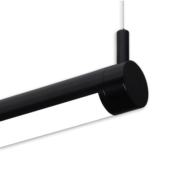 This linear tube suspension light is designed with a mix of six 24, 36 and 48-inch luminous acrylic cylinders arranged in a line, each featuring a 2.5-inch diameter LED tube with a glare-free acrylic lens for even light distribution. This suspension light operates with a 0-10V dimming driver at 120-277V or TRIAC and ELV dimming at 120V, emitting a soft white 3000K light with a 90 CRI and delivering 15,294 lumens. Each tube light is suspended from a 9-foot adjustable aircraft cable. It's ideal for reception desks, restaurants and public spaces.