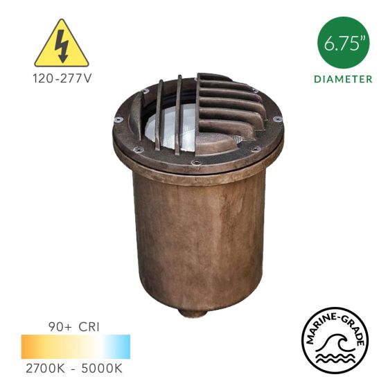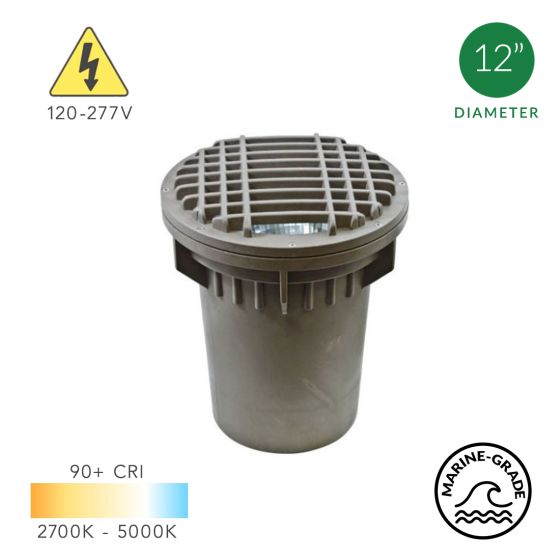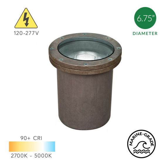 This 5-inch in-ground LED well light features a 3,000 lb drive-over rating and delivers 500 lumens at 5 watts for landscape applications. Built with marine-grade 316 stainless steel and a heat-resistant flat glass lens, the fixture includes a 25° adjustable ceramic socket and pre-wired 3-foot burial cord. The sealed construction includes a silicone gasket and injected molded composite housing for UV stability. Select a static CCT of 2700K, 3000K, 4000K or 5000K. Designed for in-ground direct burial or concrete encasement with 12V input.