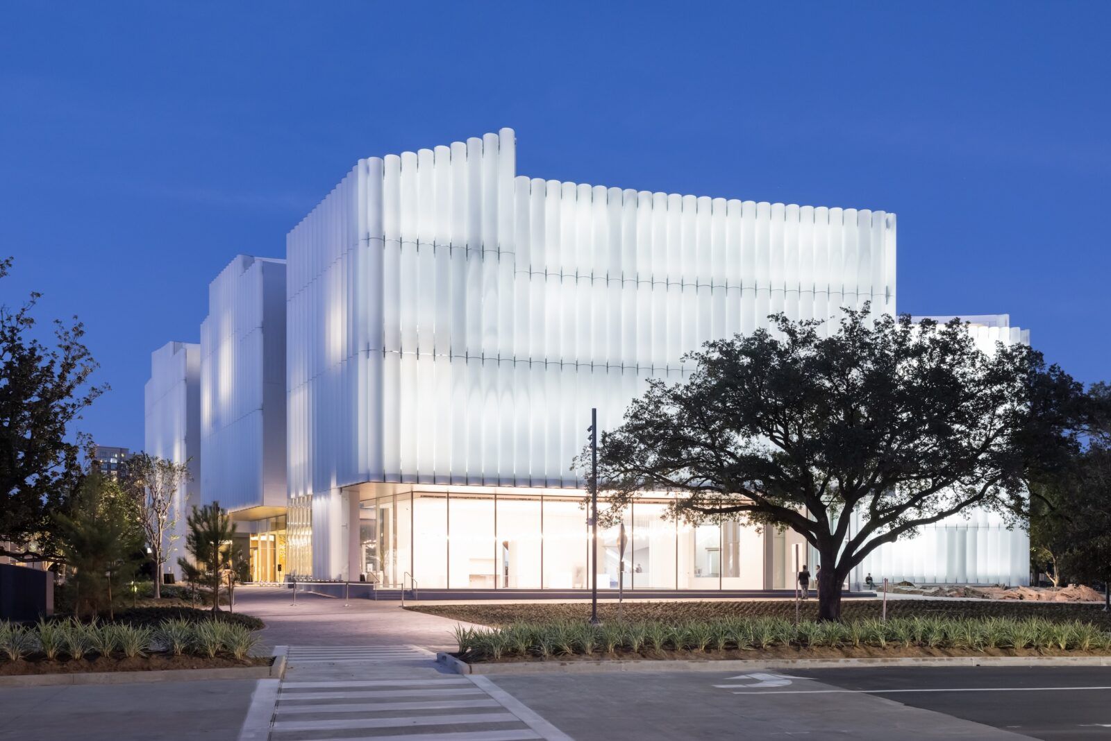 The Nancy and Rich Kinder Museum of Fine Arts combines translucent facade glow with perforations from the interior for an engaging design. The surrounding glass tube curtain wall is illuminated from within. The technique of allowing specific moments of light to shine through the material, suggests energy from programs inside. The contrast between bright and dark conditions along the facade transitions the facade’s language from a glowing volume to a discreet playfulness of the pedestrian experience. The moments of light that penetrate the promenade-facing facade invite the curiosity of the public.