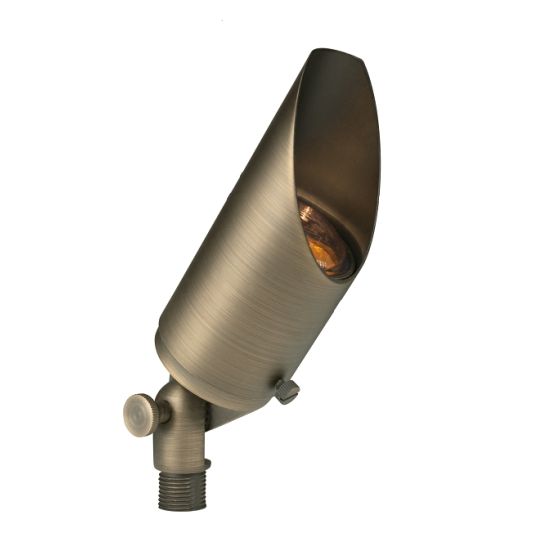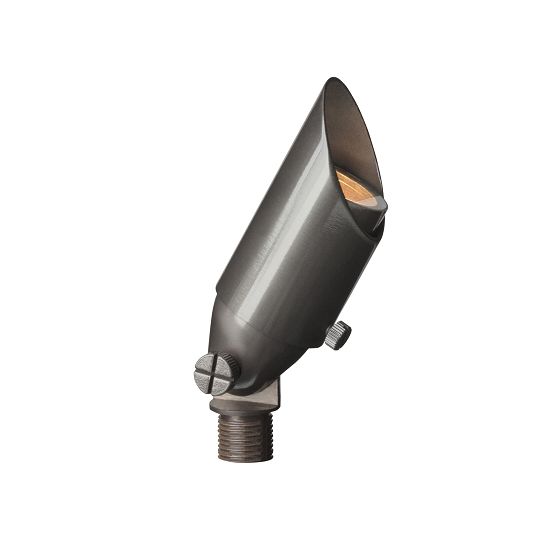 This architectural landscape LED uplight is built from corrosion-resistant brass with a bronze finish for durability in outdoor environments. A clear, heat-resistant convex glass lens ensures optimal light transmission. An adjustable cast brass knuckle with a thumb screw allows precise aiming, while the shroud reduces glare with targeted illumination. The fixture includes a spring-loaded ceramic bi-pin socket and a watertight silicone gasket for reliable performance. Prewired with a 3' direct burial cord, the landscape light operates at 12V and delivers 500 lumens at a static color temperature of 2700K, 3000K, 4000K or 5000K. A standard injection-molded spike mount is included, with optional mounting accessories available.
